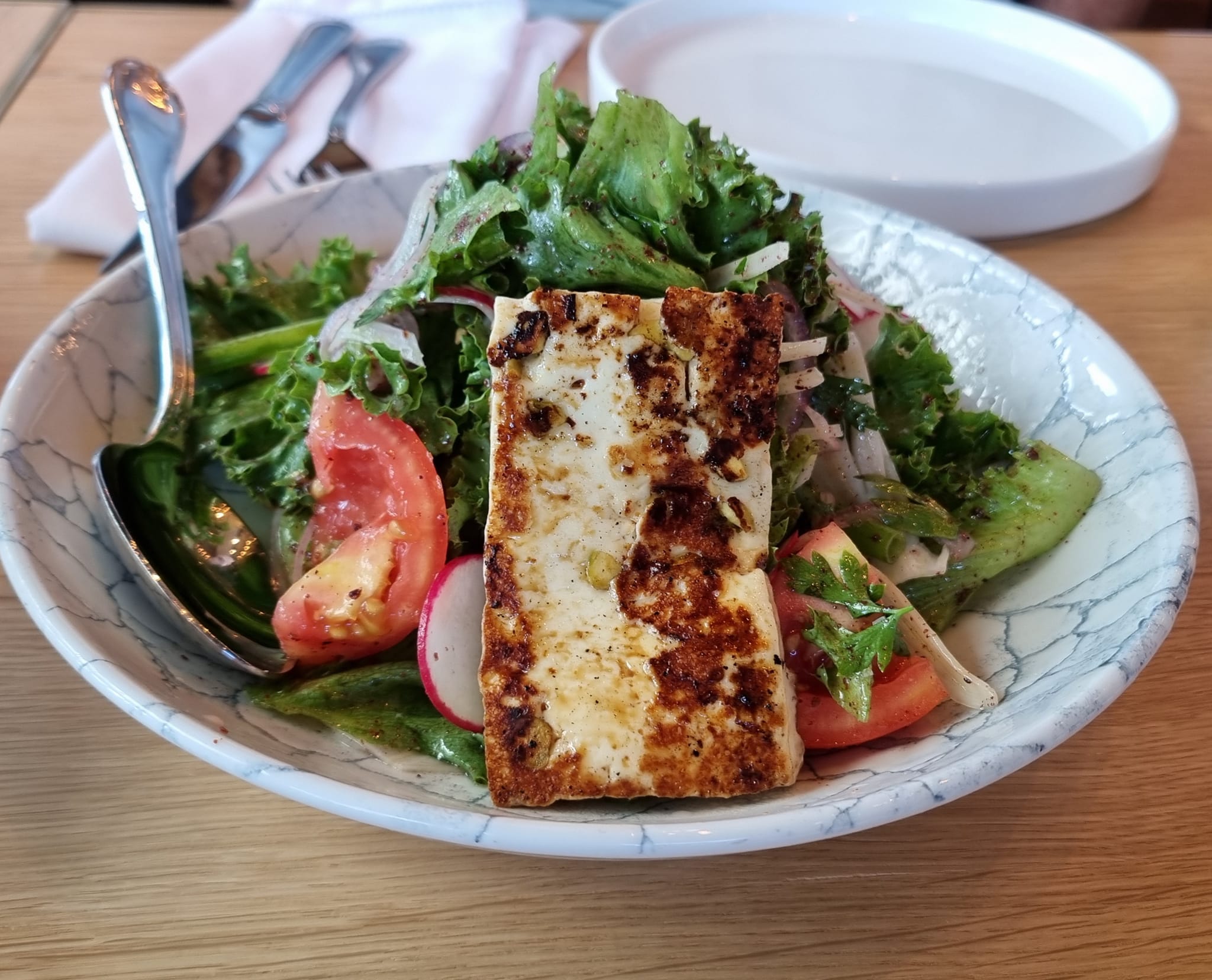 סלט חמצמץ, טרי וטעים שהונח על יוגרט כבשים קרמי.