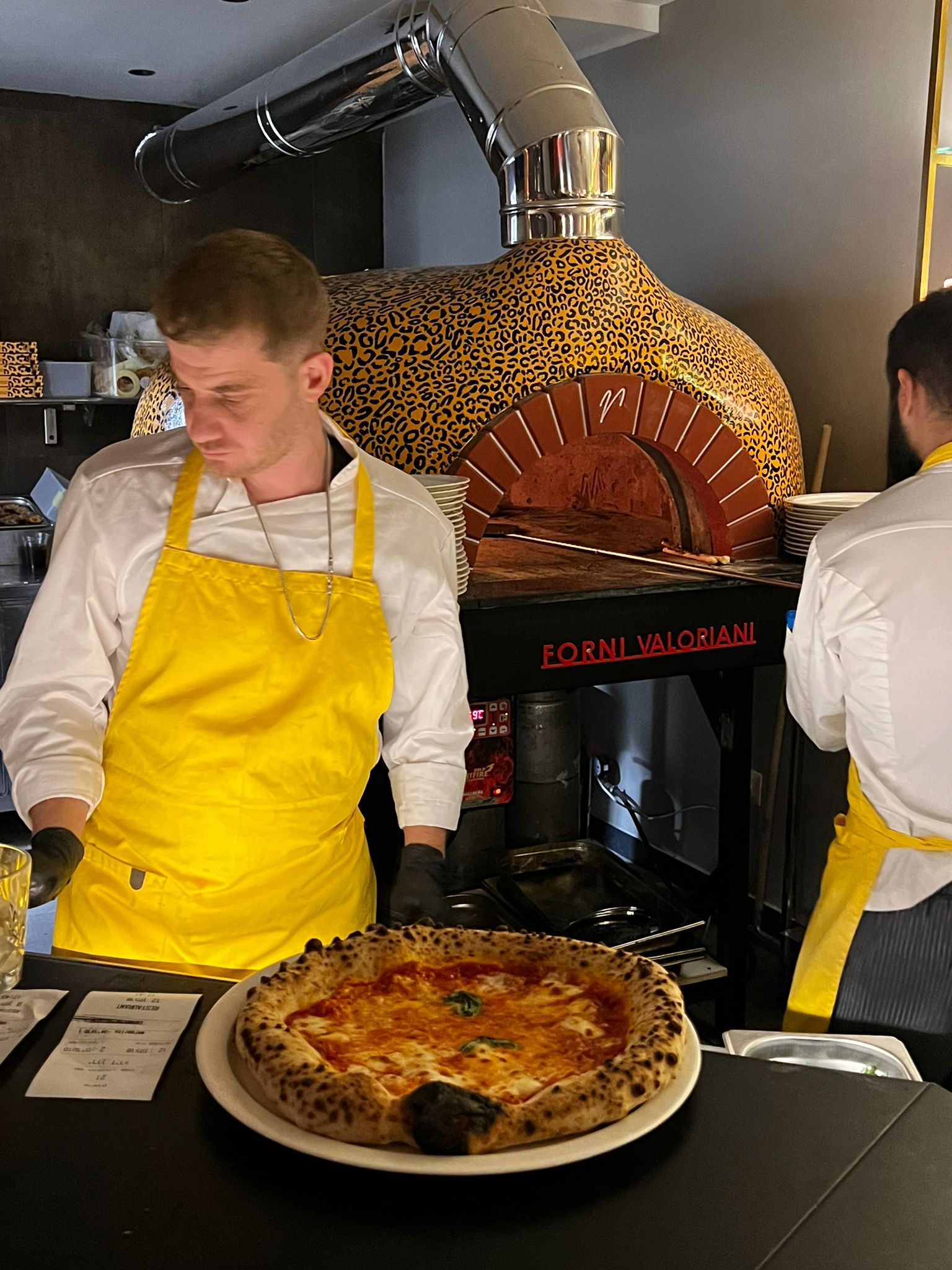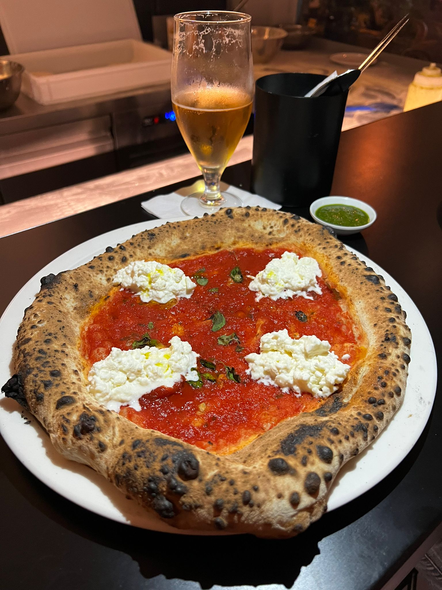 הפיצה יצאה מהתנור חמה, בסיס דק וקצוות תפוחים ומנומרים, הרוטב עגבניות מעגבניות סאן מרזנו המפורסמות-אדומות ובוהקות, גבינת סטרצ'טלה, אורגנו, שום קונפי, שמן זית,ומטבל פסטו מצויין בצד, 72 ש"ח.