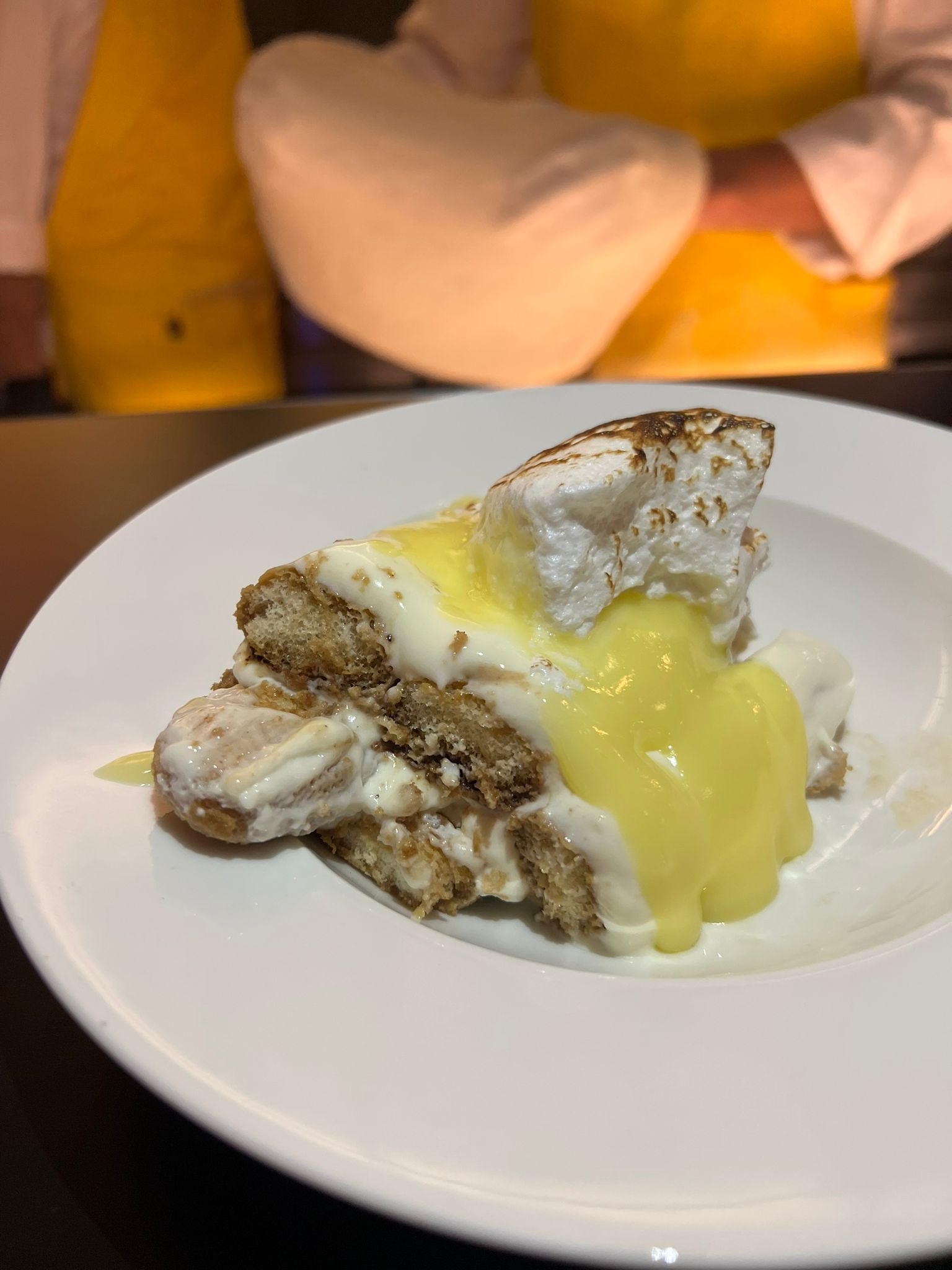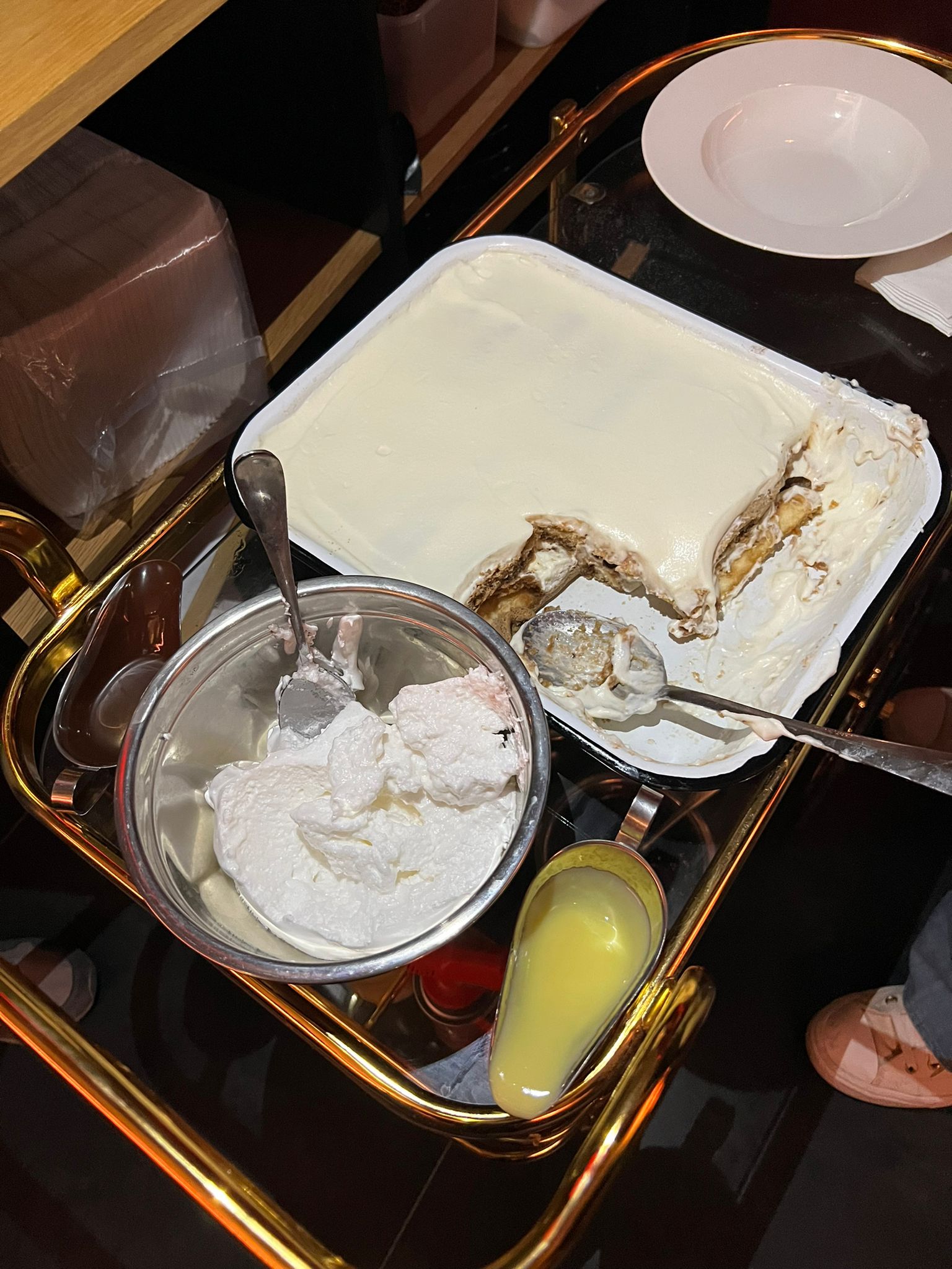 הרכיבו לנו אותו היישר מהעגלה כמו שמרכיבים וקוצצים טרטר במסעדה צרפתית מול האורחים אז כזה עם טירמיסו. טירמיסו במרקם ענני, לא מתוק מדי, עם מרנג עשיר ומעט חרוך ורוטב לימוני משגע.