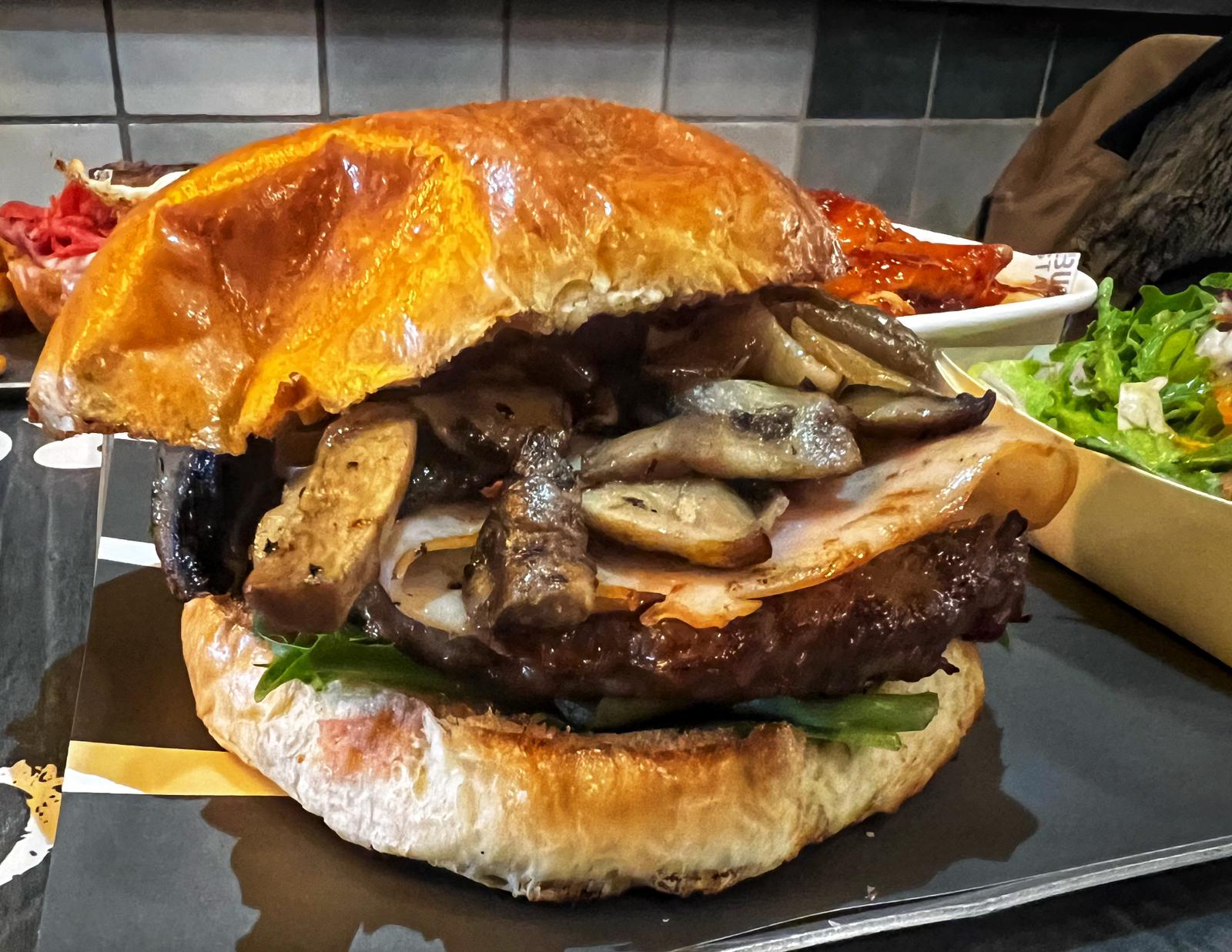 המבורגר פריז -קציצת 200 גרם, איולי כמהין, חסה לליק, בצל מקורמל, שפע פטריות פורטובלו ואווז על הפלאנצ׳ה