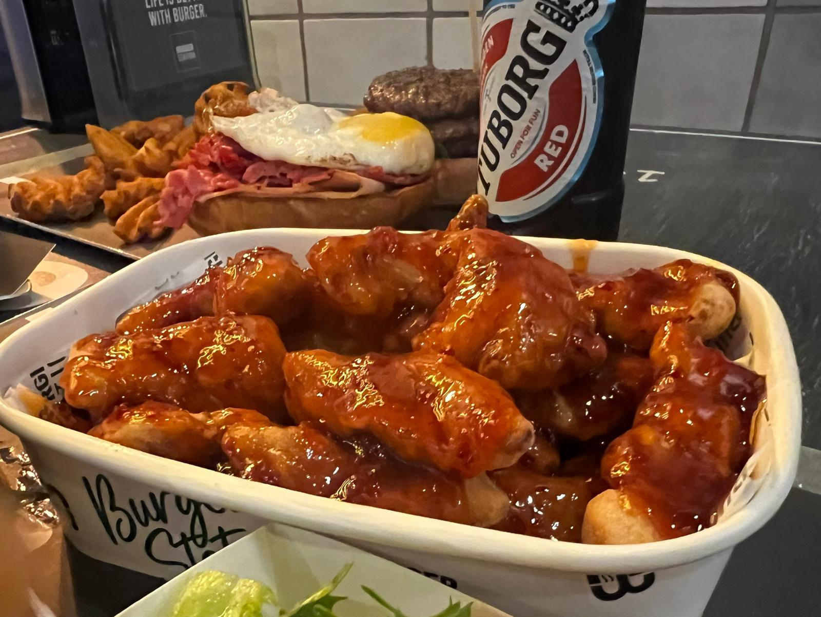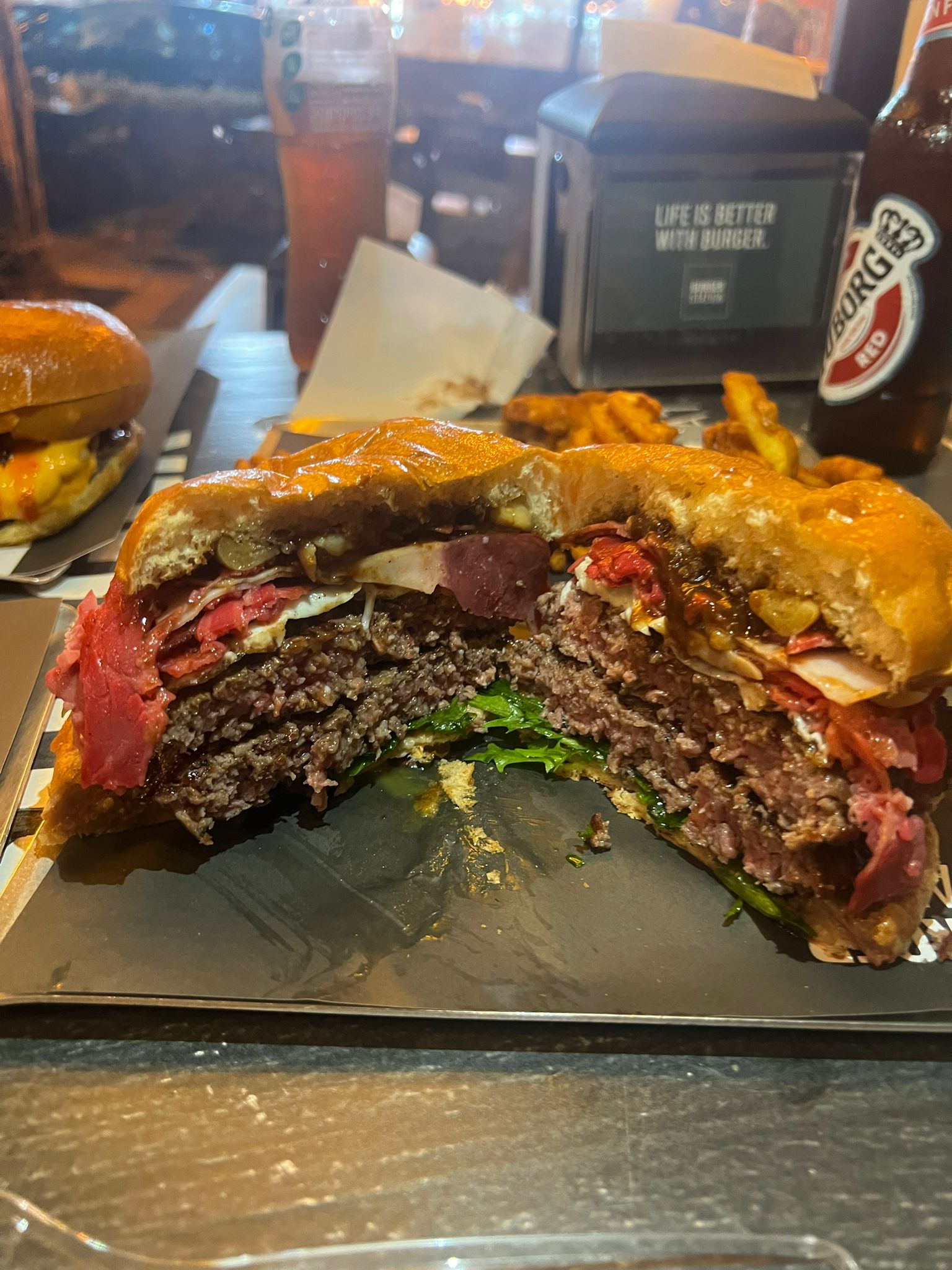 המבורגר המוגזם– מוגזם כשמו כן הוא,עשוי משתי קציצות בקר גדולות ועסיסיות, 200 גרם כל אחת, מלוות ברצועות אסאדו מעושן מפורק ואווז, ביצת עין, שום קונפי, חסה ורוטב ברביקיו.