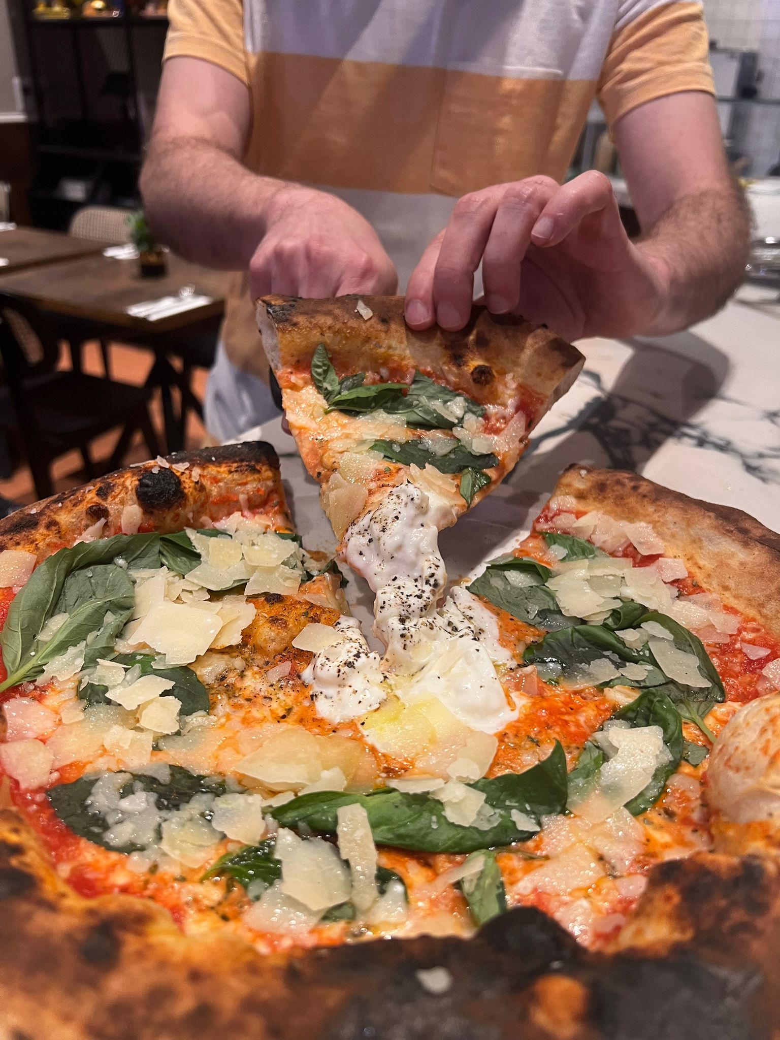 פיצה וודקה סטריטצ׳לה -רוטב מעגבניות סאן מרנזנו עשיר,שוט של וודקה שרק מחדד טעמים, גבינת סטריטצ׳לה -הקרם הרך של הבוראטה, שום, גבינת גראה פאדנה ובזיליקום.