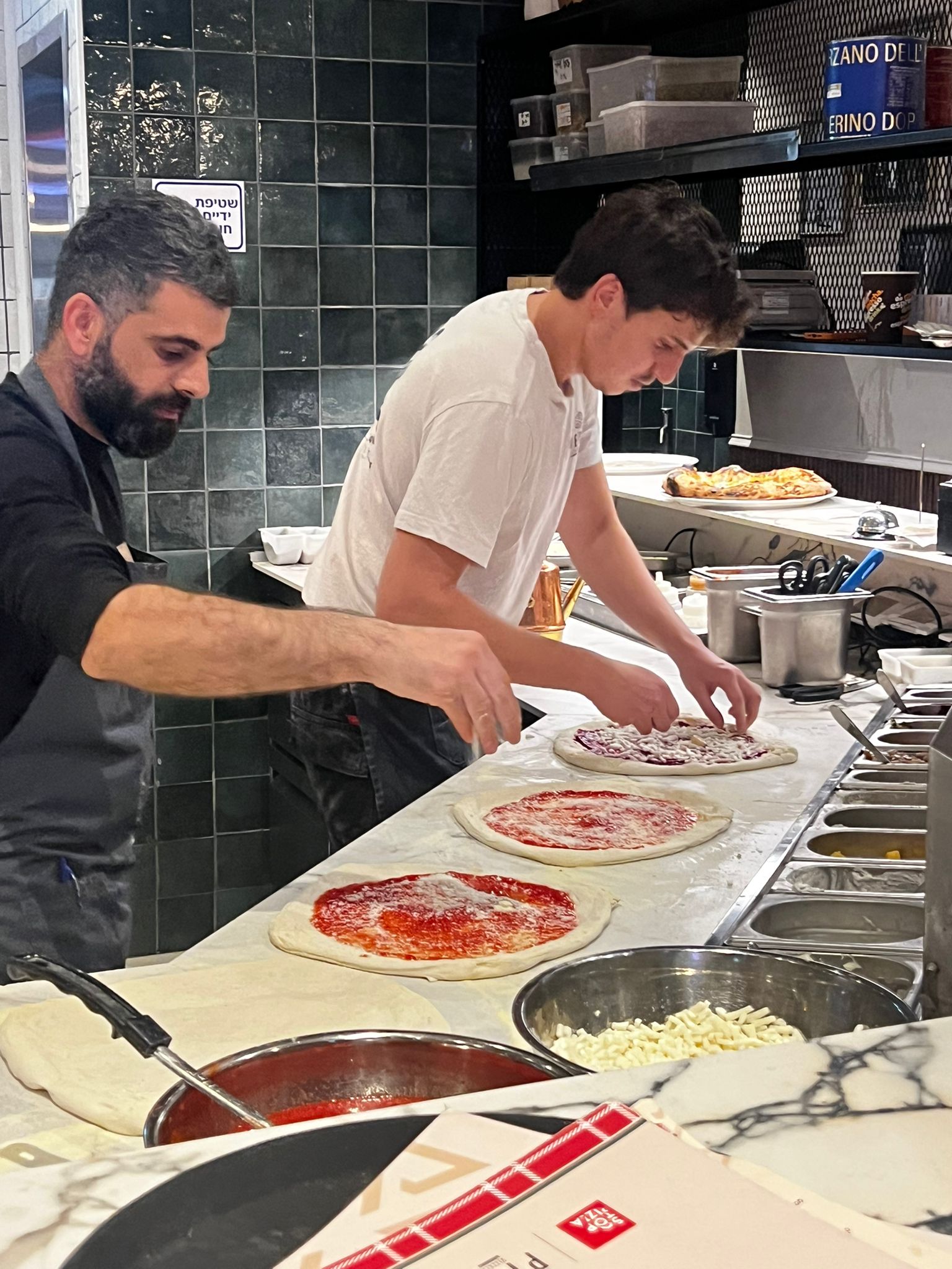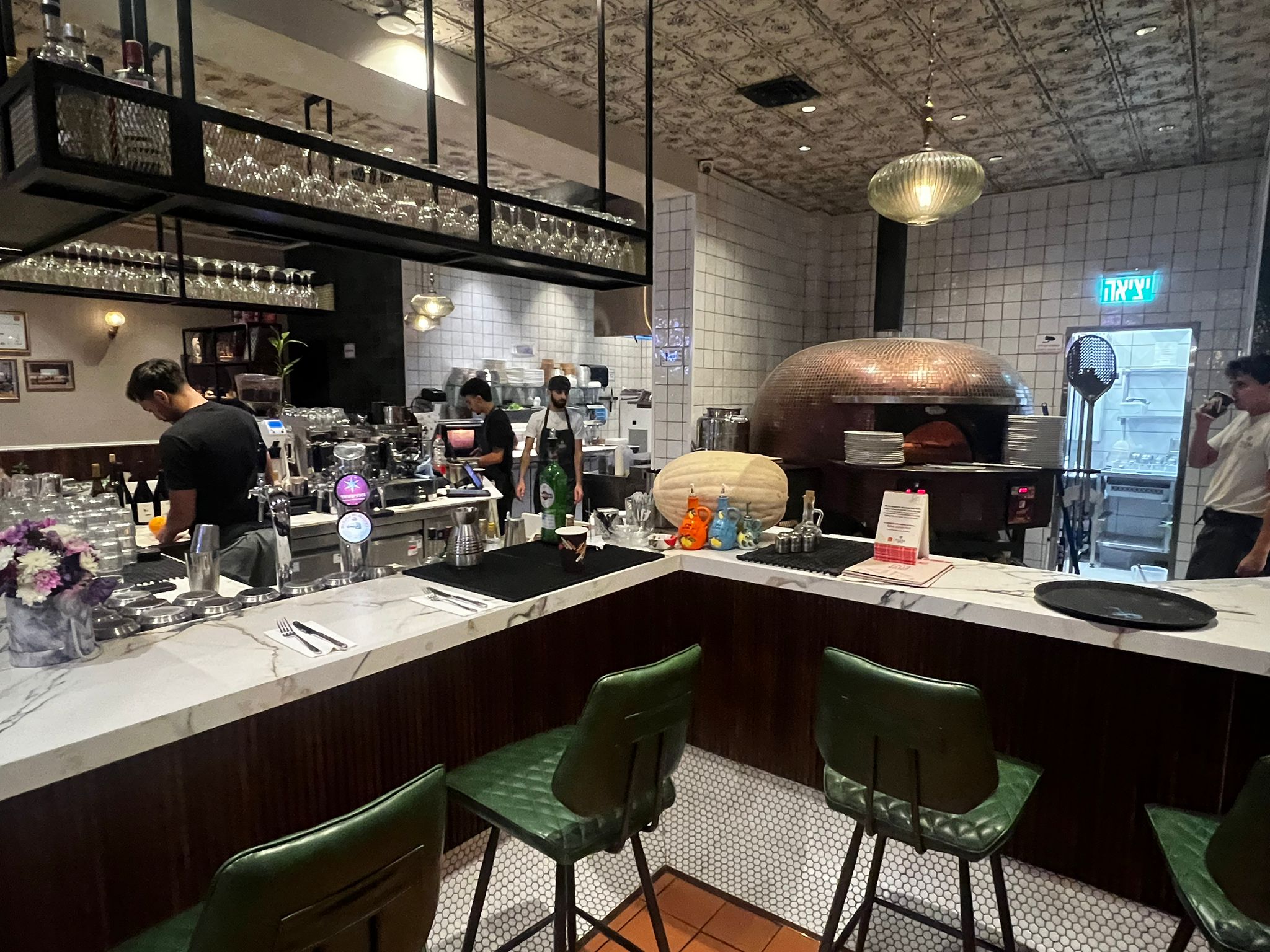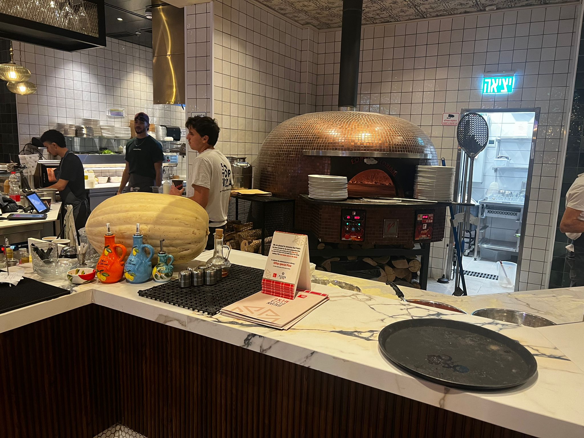 ישבנו על הבר המשקיף על הטאבון עצים שיובא מאיטליה והפיצות בו נאפות מעל 400 מעלות חום.