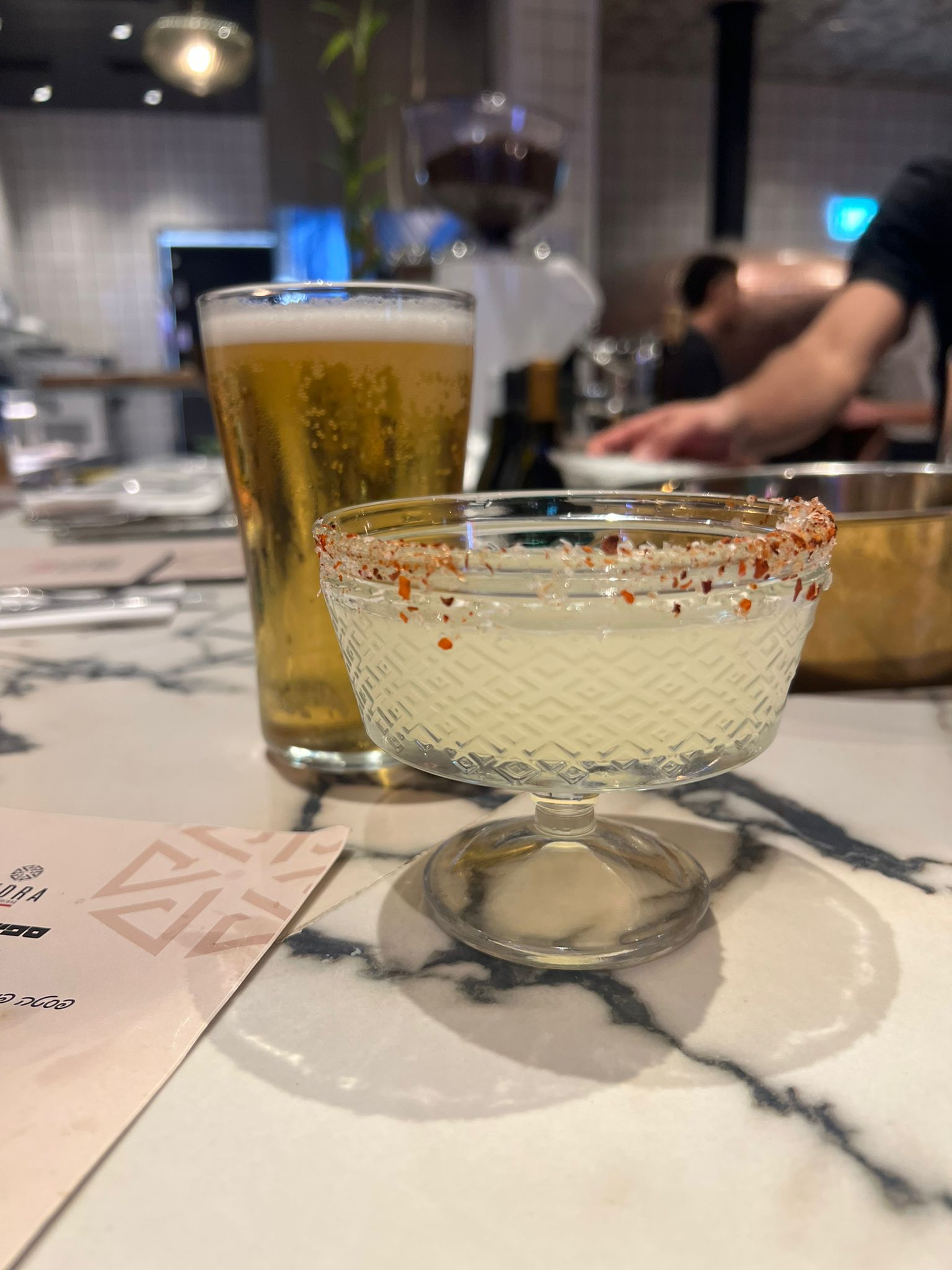 פתחנו האת הערב עם מרגריטה חמצמצה וכתר פלפל צ׳ילי אדום ובירה.