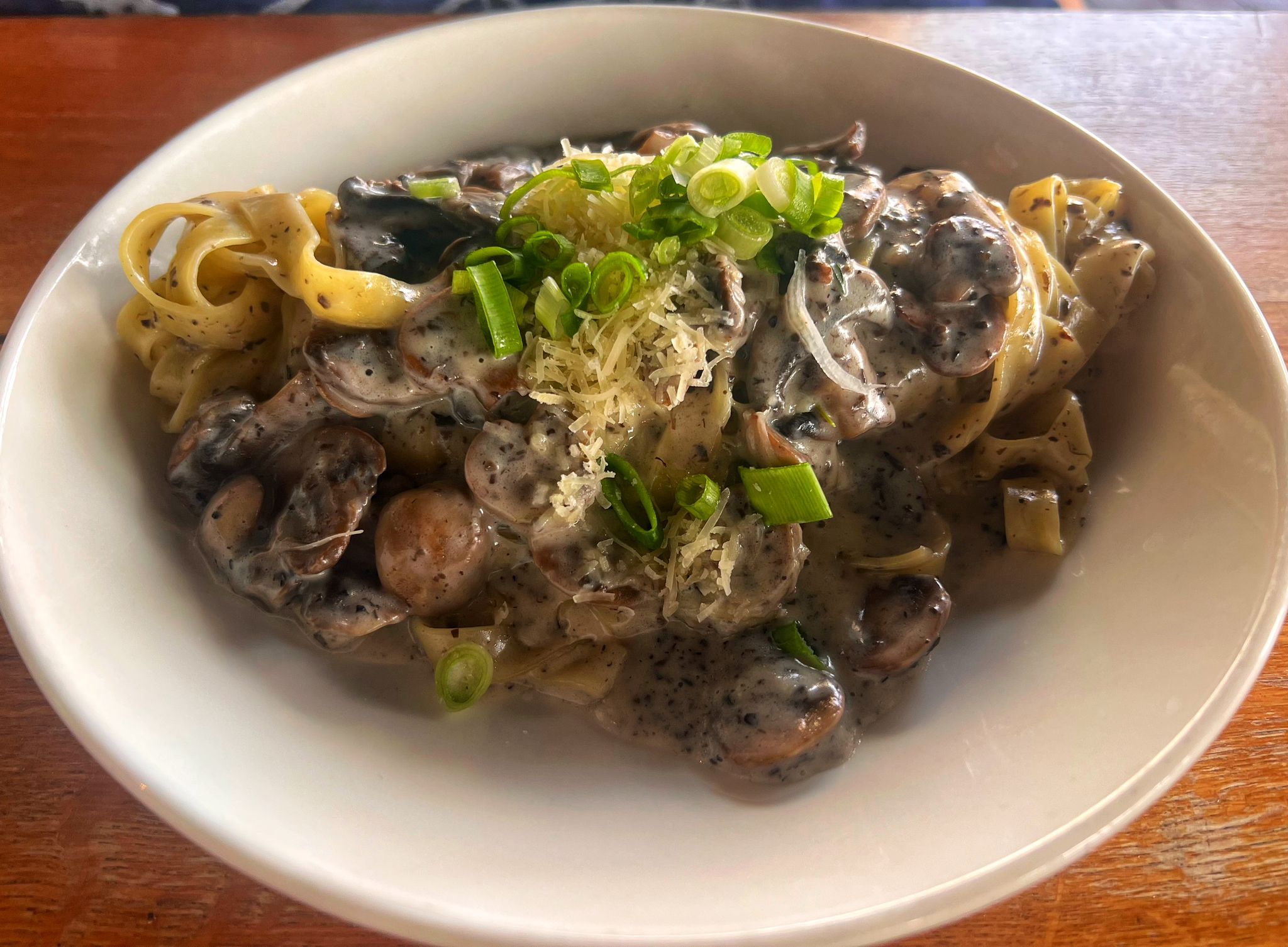 חברתי בחרה בטרטופו, פטוצ'יני, שום, שמנת, פטריות, מחית כמהין, פרמז‘ן ובצל ירוק.
