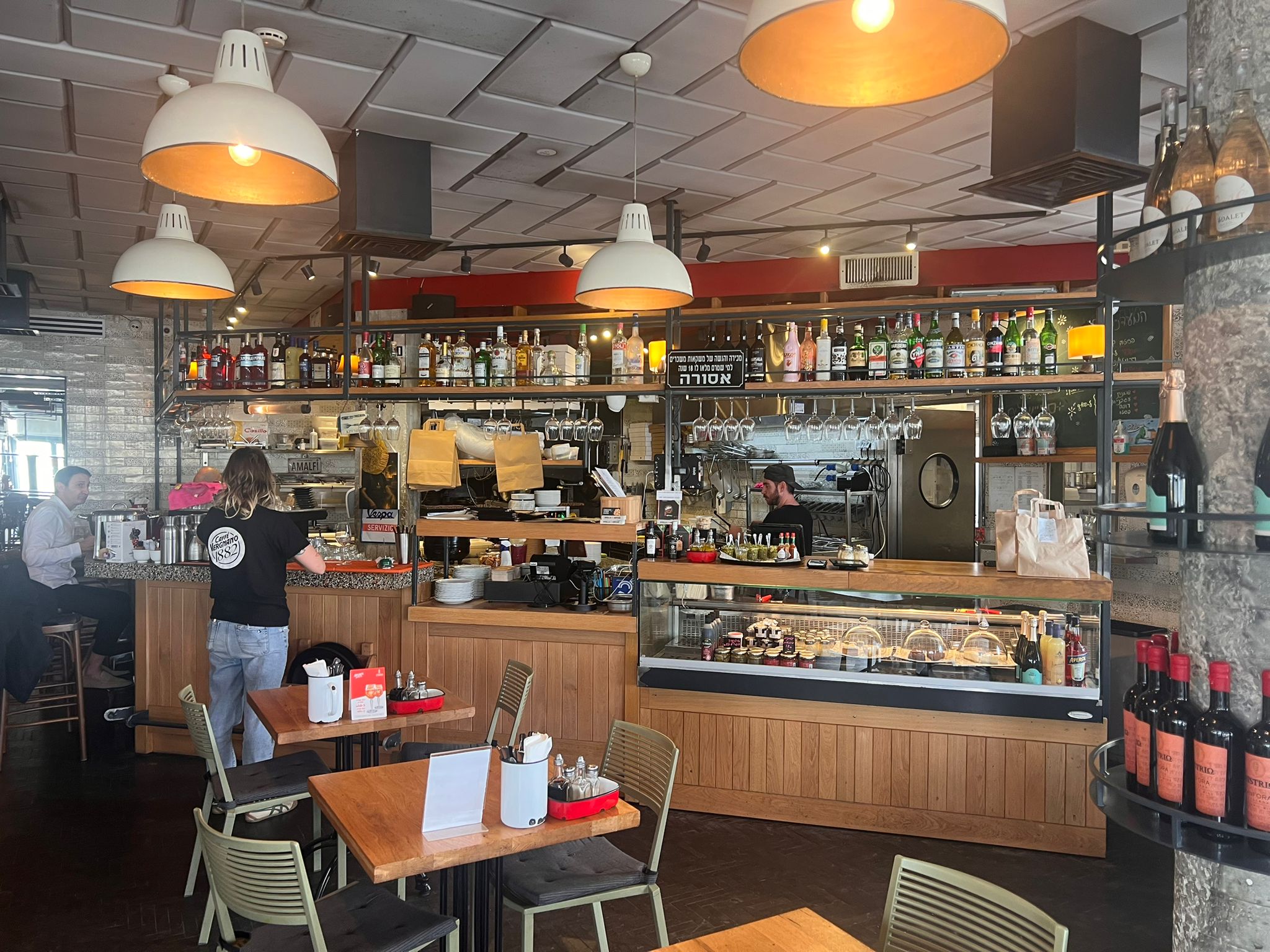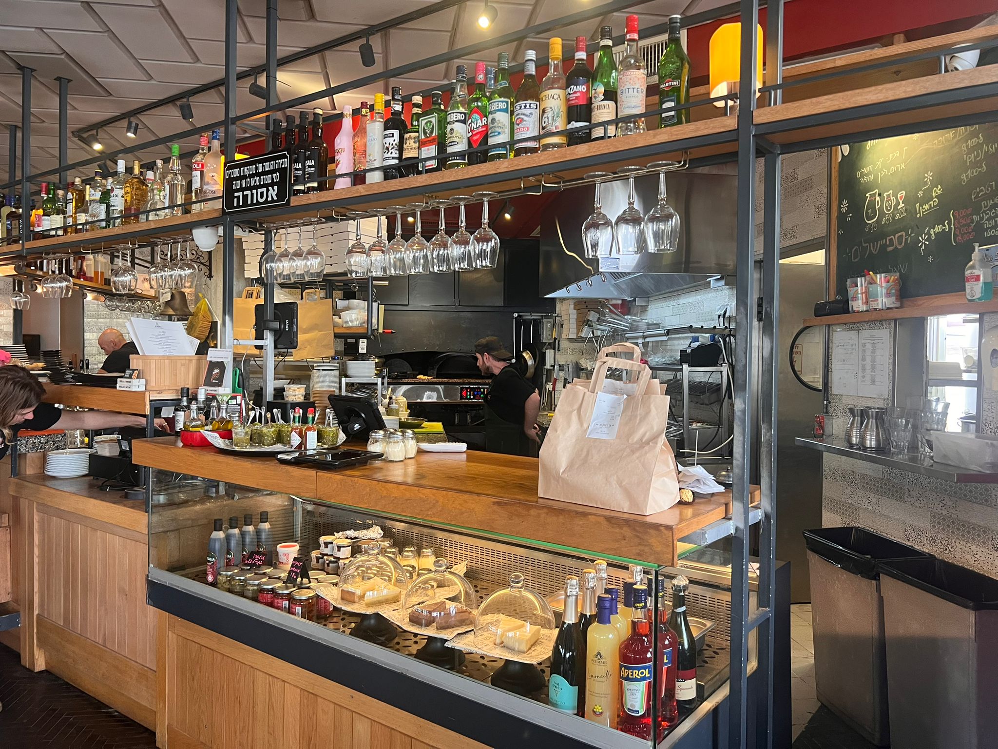 מטבח פתוח ובו תנור לבנים לוהט בלב המסעדה שממנו נאפות פוקאצ׳ות ופיצות חמימות ומגרות ומגוון רחב של אלכוהול להשלמת הסינרגיה ואווירת הצ'יל בצהריי היום כי אני בחופש 😊