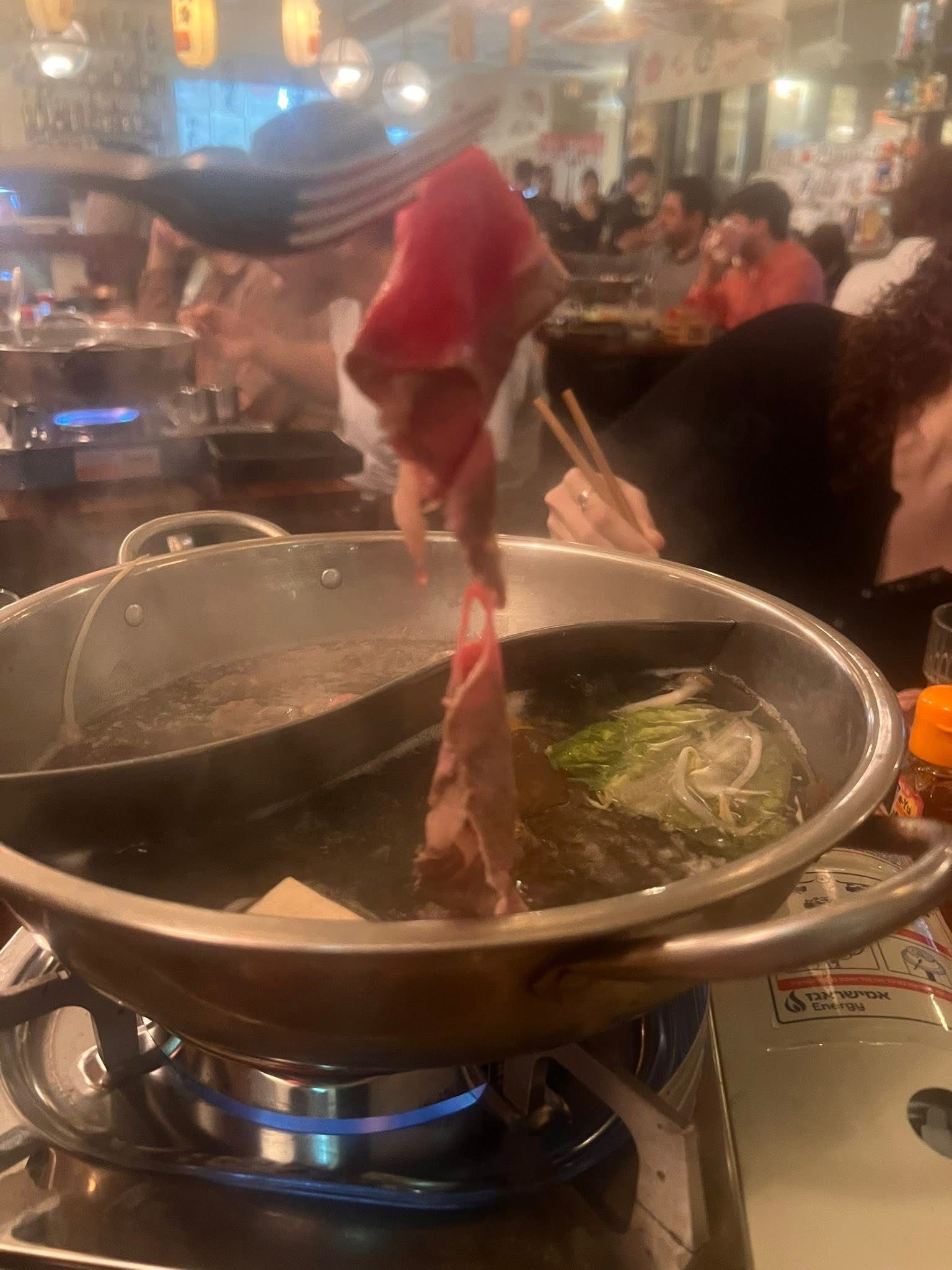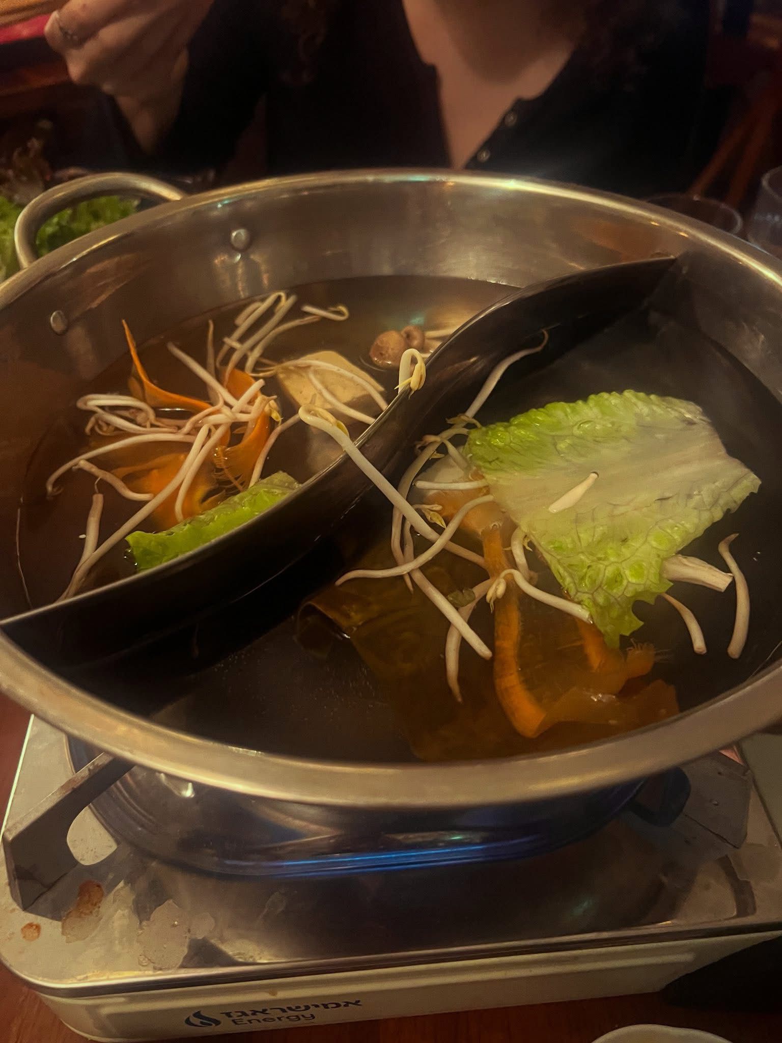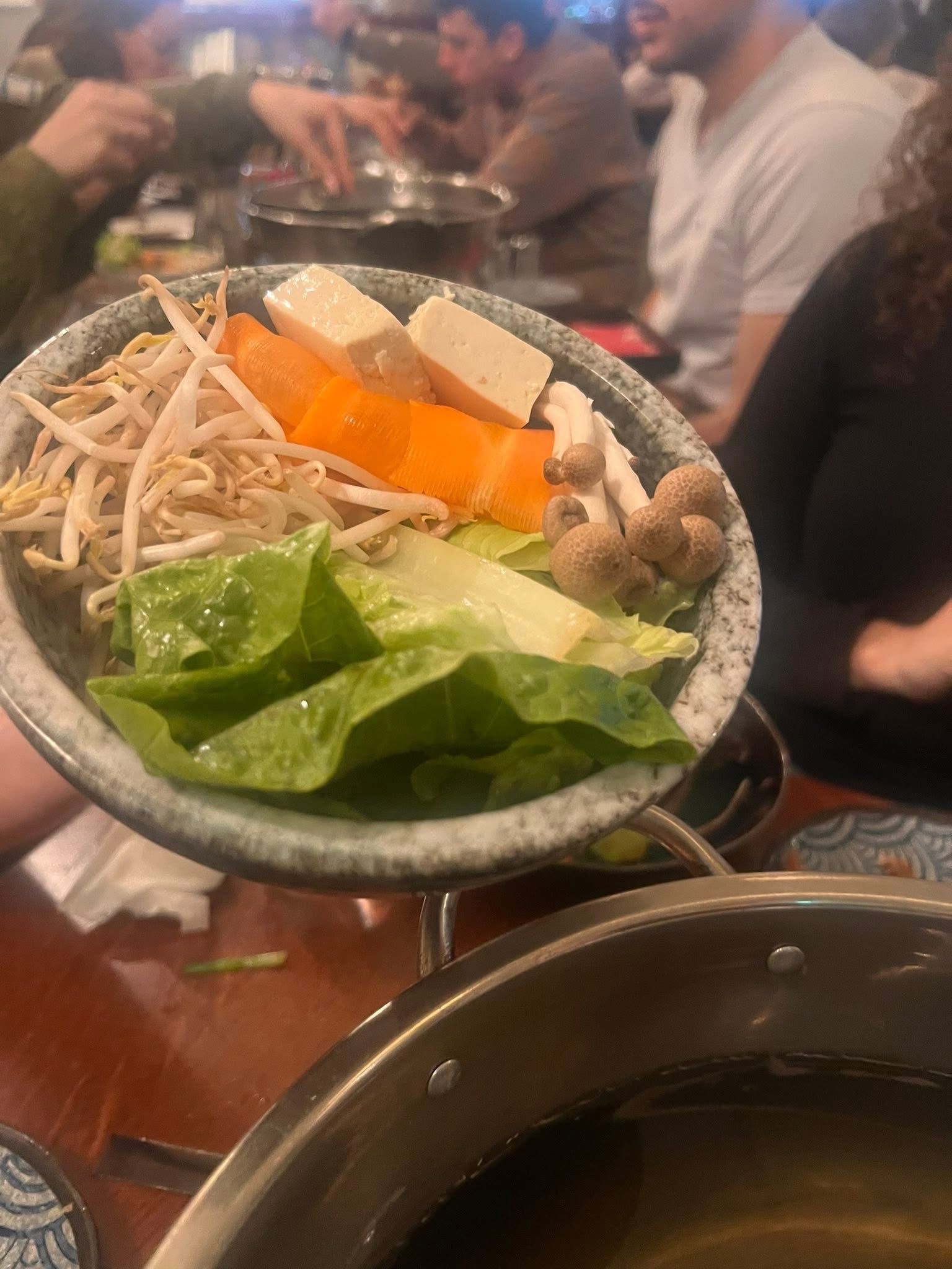 סיר מחולק עם 2 צירים מבעבעים שאליו מכניסים מגוון ירקות שהיה יחסית דל למה שאני מכירה בהוט פוט הסיני: כרוב סיני, גזר, פטריות שימאג'י, טופו
