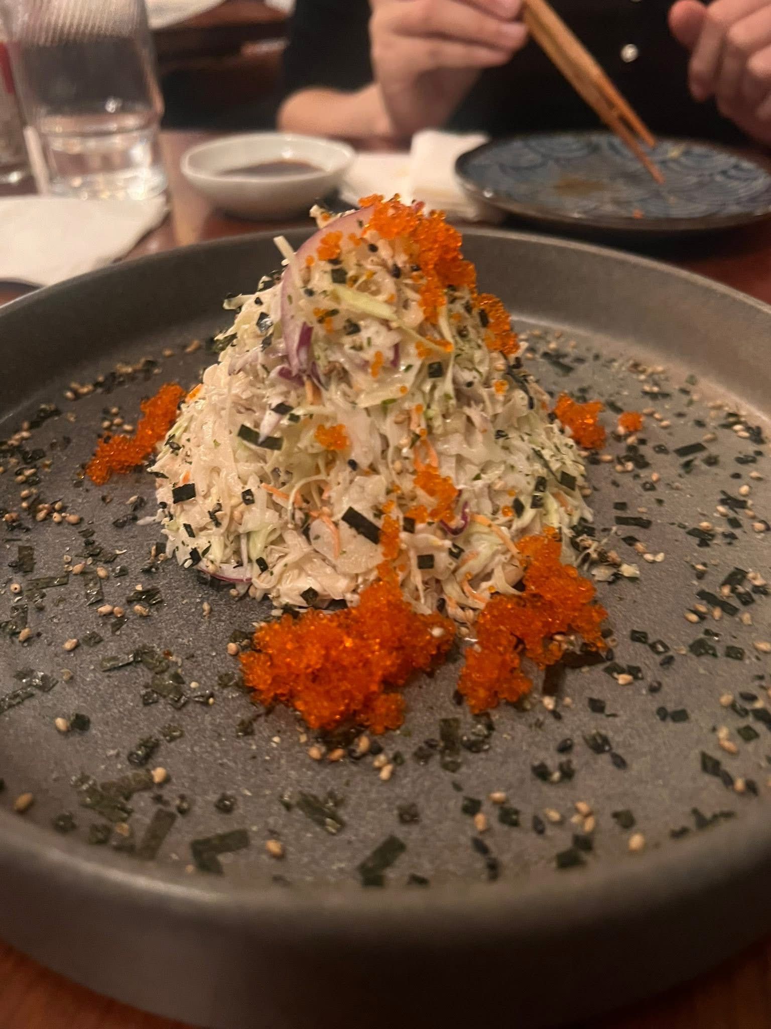 סלט פוג'יאמה-כרוב לבן, בצל סגול וגזר עם טוביקו, חלש בתיבול.