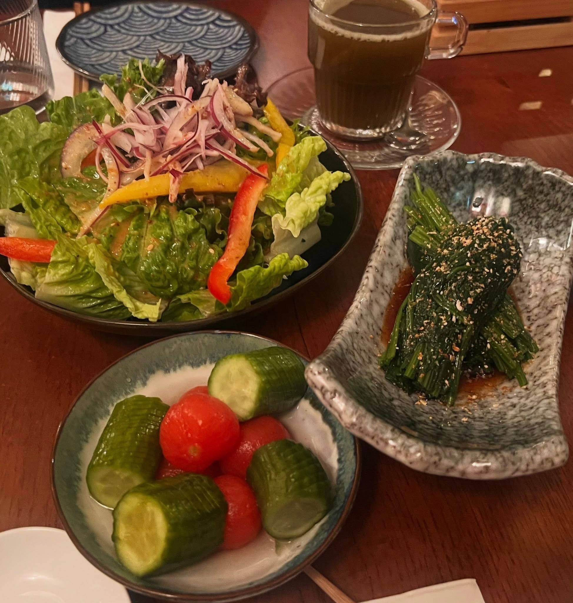חמוצים יפניים וירקות מטוגנים במרינדת דאשי שהיו תפלים לגמרי.