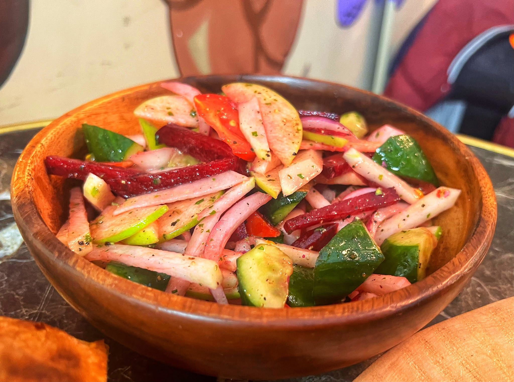 סלט מירקות חתוכים גס, פרוסות דקות של תפוח ירוק חמוץ, רצועות דקות של סלק וקולורבי, צנונית,בצל סגול בתיבול שמן זית לימון וסומק.